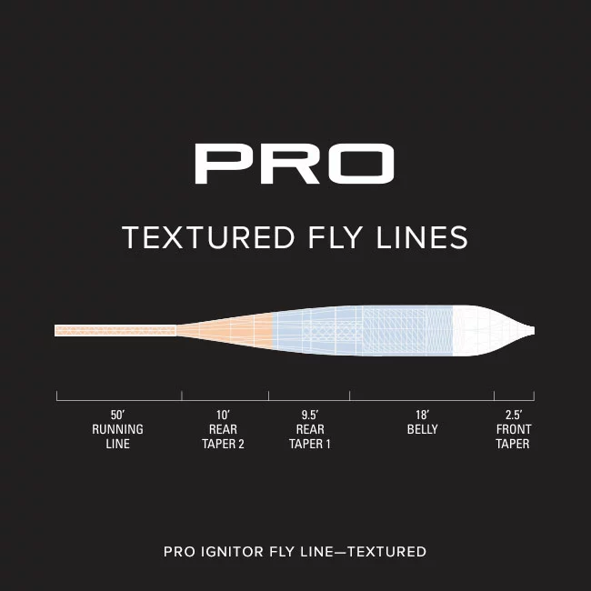 The Orvis Pro Ignitor Fly Line Textured is a fast loading, powerful, weight-forward textured floating fly line designed for minimal false casts. An exceptional line for saltwater, particularly when sight fishing on the flats and quick, precise casts are required. The extra-short, front taper of the Orvis Pro Ignitor Fly Line Textured helps energy transfer to turn over large flies and deal with challenging wind conditions. PRO Textured lines offer increased surface area, allowing the line to sit higher in the water, offering less drag, easier mending, less water spray and easier pick-ups. The micro-textured surface traps air to provide increases in both shootability and floatation while decreasing friction. The Orvis Pro Ignitor Fly Line Textured is available in WF in line-classes #8 โ 12.