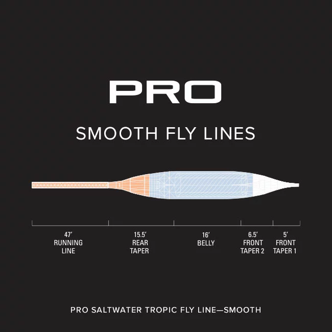 The Orvis PRO Saltwater Tropic Fly Line is an exceptionally smooth fly line designed to meet the needs of anglers chasing tropic game fish, whether by skiff or wading the flats. The Orvis PRO Saltwater Tropic Fly Line was built with a stout head for wind-cutting power and distance casting ability, and yet the carefully engineered advanced, convex compound front taper is fine-tuned to improve the presentation for those spooky fish cruising a flat.