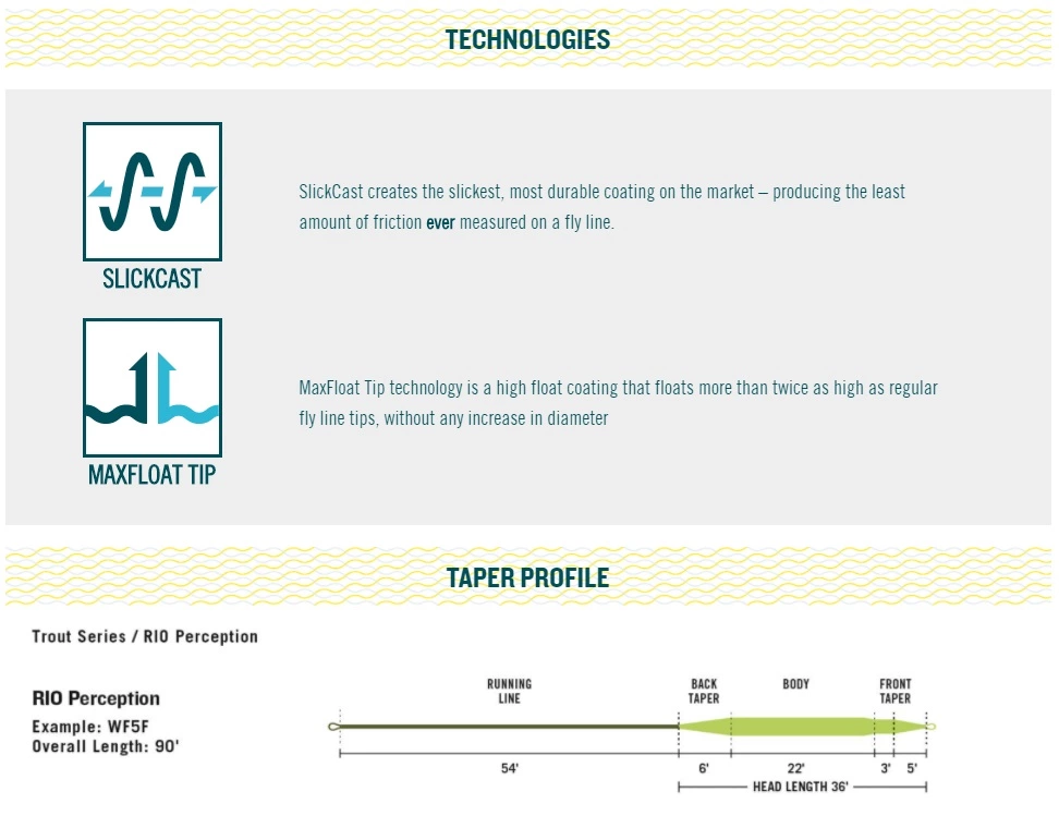 The RIO Products Premier Perception Floating Fly Line is an easy casting, general purpose fly line that casts nymphs, dry flies, streamers and soft hackles with ease. The short head of the RIO Products Premier Perception Floating Fly Line makes this a particularly good line on smaller rivers and lakes when long distance line control is not necessary.Â