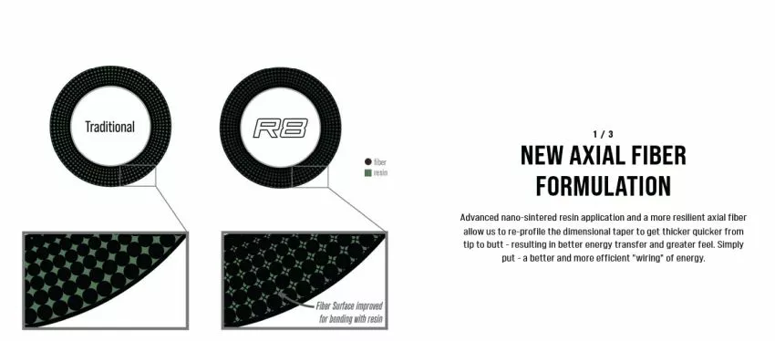 The advanced, leading-edge material behind R8 enables Sage to shape a rod with a stiffer, stronger backbone but a more sensitive tip and more connected feel. The secret is twofold. First, a proprietary aerospace composite with a greater hoop strength enables Sage to dimensionally grow taper diameter more quickly from the tip—while a nano-sintered resin application increases axial resilience and allows Sage to pack more fibre into the blank, resulting in that true two-way connection from hand to fly and back for greater feel, flow and control.