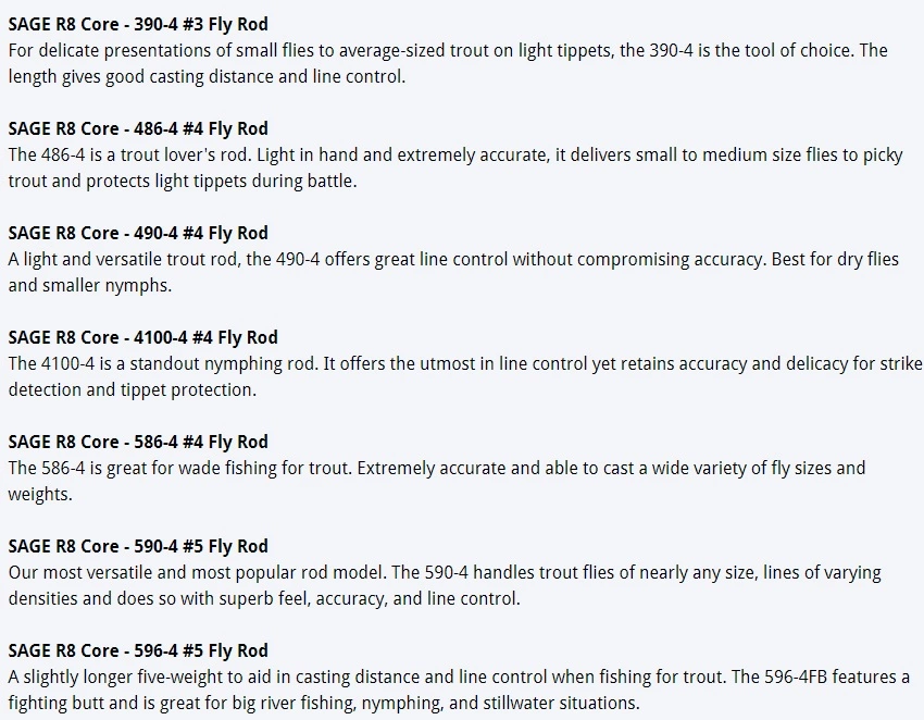 R8 Core is focused on maximum versatility and applies new revolutionary R8 material technology through our forward-thinking lens of what the people of Sage are seeing out on the water – where one rod needs to show even greater range. At its core, R8 Core traces a direct lineage to Sage’s multi-application / fast action vision, one shaped by the fishing evolutions happening all around us – from habitats we stalk and waters we frequent, to the flies we fish and the diversity of species we now target. Coming in a range from line-classes #3 to 9, with a variety of lengths from 8’6″/260 cm to 10’0″/305 cm, there is sure to be a model to fit the core needs of every freshwater angler.